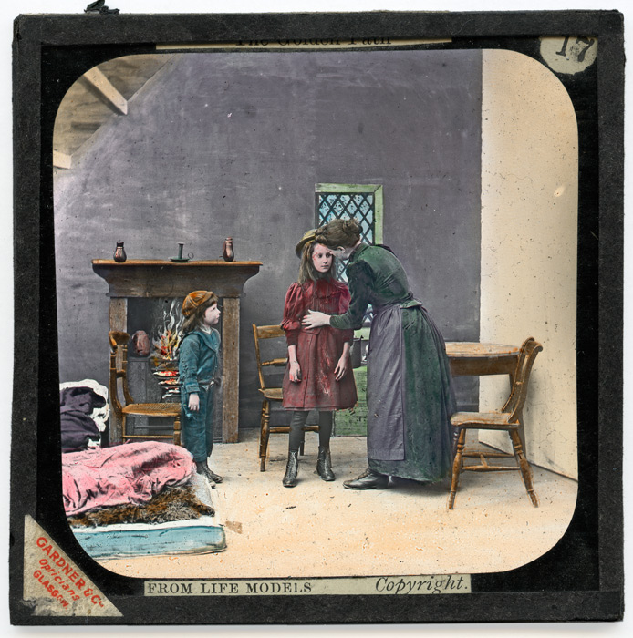 Klíčová slova: Lanterna Magica / Education morale / photographie rehaussée de couleurs, plaque carrée fixe