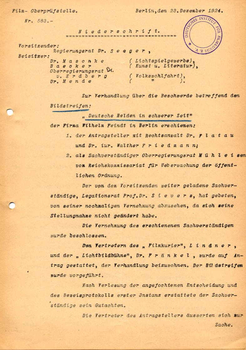 Popis: The production company "Wilhelm Feindt, Berlin" applied against the ban of the film "Deutsche Helden in schwerer Zeit" at the censorship headquarter in Berlin. The application was accepted. The film was permitted without age restriction.