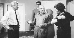 Peter van Eyck, David Cameron, Fritz Lang, Dawn Addams (v.l.n.r.) bei den Dreharbeiten