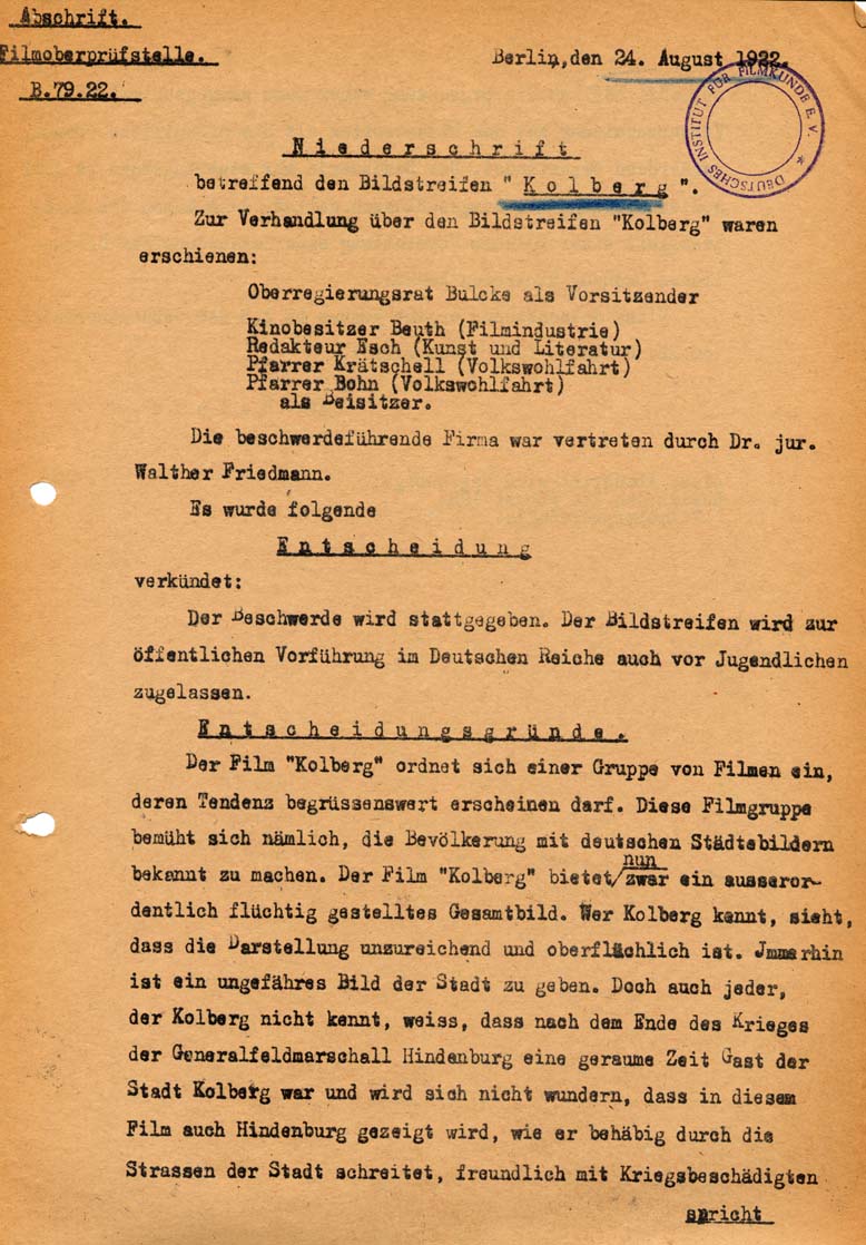 Popis: The production company applied against the ban of the film "Kolberg" at the censorship headquarter in Berlin. The application was accepted. The film was permitted without age restriction.
