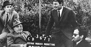 Michel Piccoli, Fritz Lang, Jack Palance, Jean-Luc Godard (v.l.n.r.)
