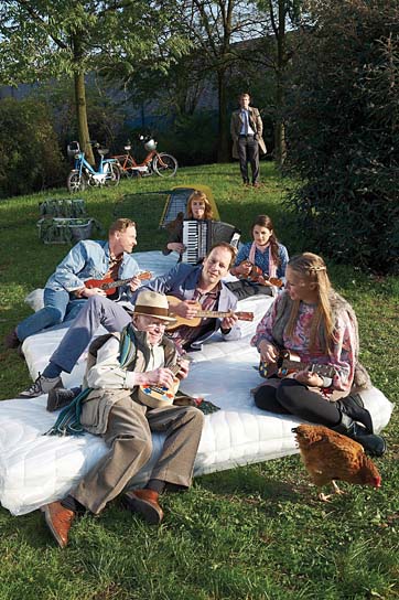 Roland Jankowsky (back), Helene Grass (back, in the middle), Hubertus Hartmann (on the left), Jochen Picht (in the middle), Heinz W. Krückeberg (front), Nina Proll (on the right) in "Frohes Schaffen ...