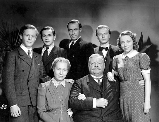 Gunnar Möller, Günther Körner, Wolfgang Lukschy, Ernst Schröder, Ilse Petri (standing, from left to right), Renée Stobrawa, Heinrich George (both sitting) in "Die Degenhardts" (1943/44)