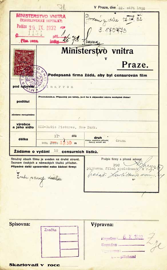 Beskrivelse: Film distributing company applies for censoring of the film "Cimarron". The film was qualified for public screening - ban for young people.
