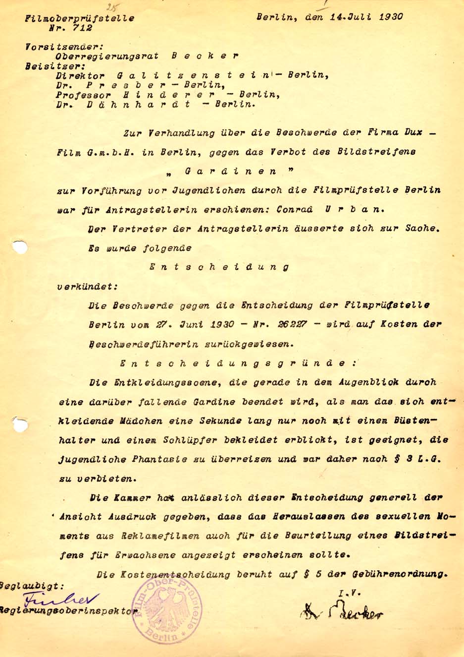 Beskrivelse: The production company "Dux - Film G.m.b.H., Berlin" applied against the ban (for young people) of the film "Gardinen" at the censorship headquarter in Berlin. The application was rejected.