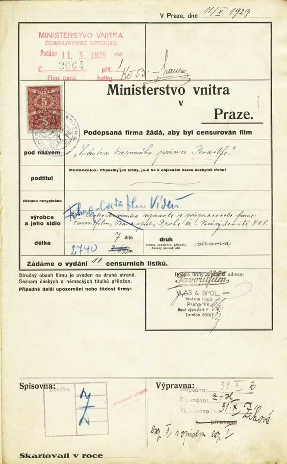 Beskrivelse: Film distributing company applies for censoring of the film "Láska korunního prince Rudolfa". The film was completely interdicted.