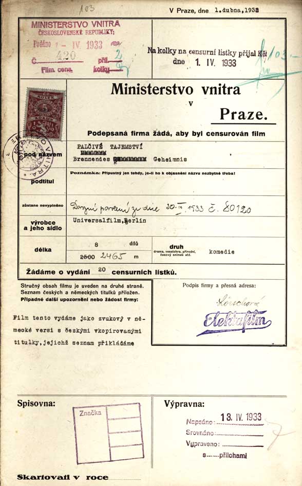 Beskrivelse: Film distributing company applies for censoring of the film "Palčivé tajemství". The film was qualified for public screening - ban for young people.