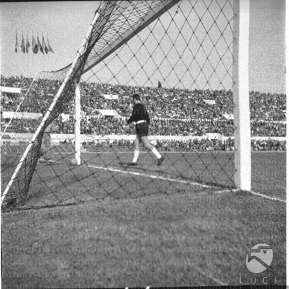 Portiere della Juve colto nel riprendere una palla-goal. Campo lungo
