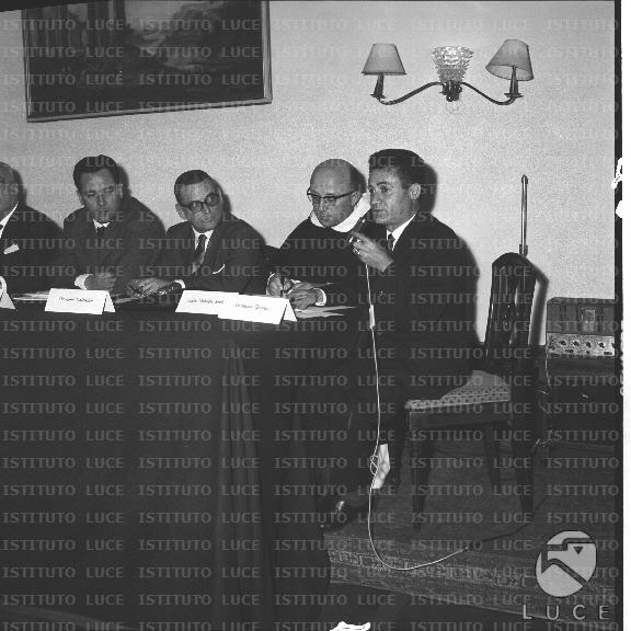 Andre titler:Relatore tiene discorso durante un convegno organizzato dalla D.C.; accanto a lui padre Gabriele Sinaldi, Gianni Camindoli e Luciano Paolicchi - totale