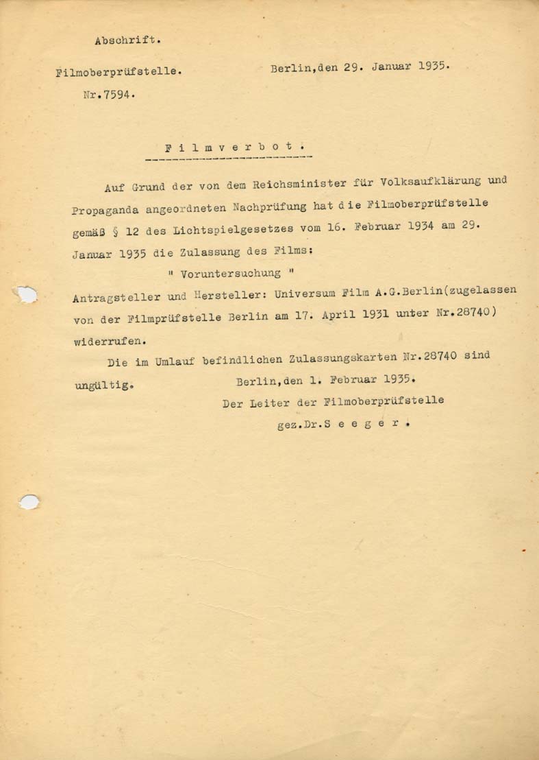 Beskrivelse: The Ministry for Enlightenment of the People and Propaganda applied for revocation of permission of the film "Voruntersuchung". The application was accepted.