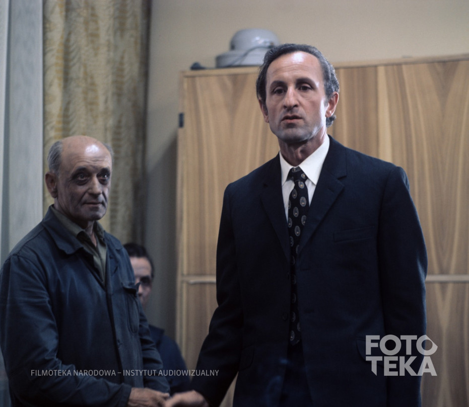 Beskrivelse: Film still from “The Scar” (1976), dir. Krzysztof Kieślowski. From left: unknown person and actor Franciszek Pieczka. Photo: Romuald Pieńkowski, transparency 6x6 format