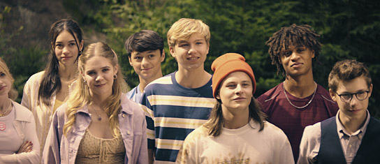 Emilia Pieske, Charlotte Hagenbucher, Lilith Johna, Emil Mascheck, Leonard Conrads, Jakob Weingärtner, Noel Diop, Thilo Fridolin Matthes (left to right) in "Die Schule der magischen Tiere 3" (2024)