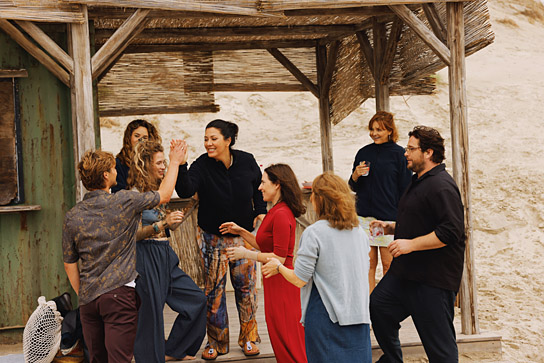 Henning Flüsloh, Katia Fellin, Marlene Tanczik, Jasmin Shakeri, Antje Traue, Annette Frier, Laura Tonke, Ronald Zehrfeld (left to right) in "Feste & Freunde - Ein Hoch auf uns!" (2024)