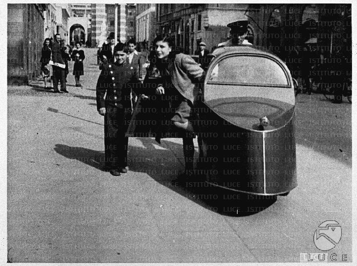 Brescia Scorcio di una via della città. Da un ciclotaxi in sosta una giovane donna scende, mentre un bambino le tiene la portiera aperta