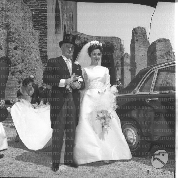 Weitere Titel: La sposa al braccio del padre ripresa mentre sale le scale per dirigersi verso la chiesa di Santa Francesca Romana - totale