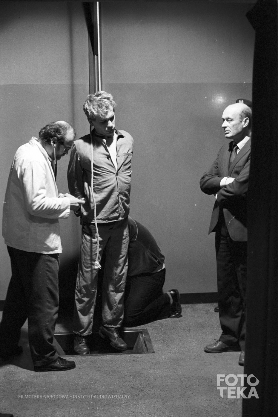 Description: On the set of “A Short Film About Killing” (1987), dir. Krzysztof Kieślowski. Execution scene. From left: actors Karol Stępkowski, Mirosław Baka and Aleksander Bednarz. Photo: Romuald Pieńkowski, black and white negative, 35 mm format