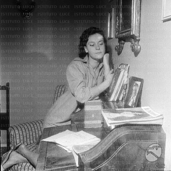 Barbara Zacconi, accanto ad uno scrittoio all'interno di una villa, osserva la foto di Ermete Zacconi - totale