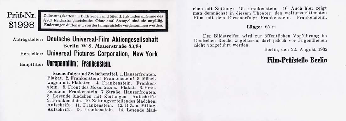 Kuvaus: The film "Frankenstein" was permitted by the censorship office in Berlin with age restriction (only for adults 18 years of age or older).