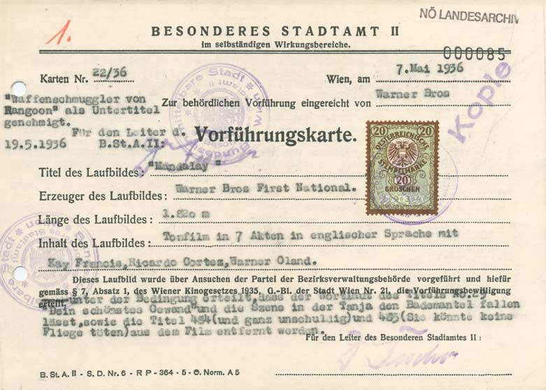 Kuvaus: The subtitle "Waffenschmuggler von Mangoon" was approved on 19.5.1936.Following parts had to be removed:1) Title 29, the words "Dein schönstes Gewand" (Your most beautiful robe)2) Scene, where Tanja drops her bathrobe3) title 484 "und ganz unschuldig" (and absolutely innocent)4) title 485 "Sie könnte keine Fliege töten" (she is not able to kill a fly)