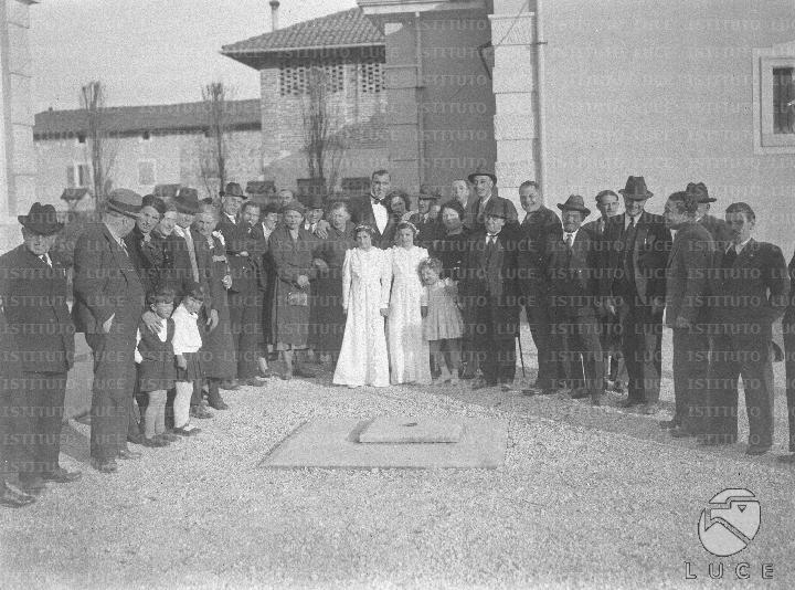Sequals Gli sposi, circondati dai genitori, dagli amici e dai parenti, posano per una foto ricordo