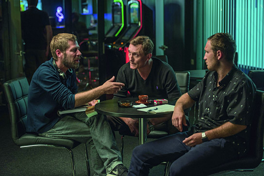 Timon Modersohn, Oliver Masucci, Frederick Lau (left to right) while shooting "Spielmacher" (2017)