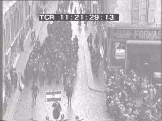Emilia Romagna (Modena) [Folto gruppo di giovani emiliani in costumi caratteristici e abiti d'epoca posa seduto e in piedi in una strada di Roma. Sullo sfondo cortina murati con affissi manifesti-guida relativi al corteo] - Campo medio
