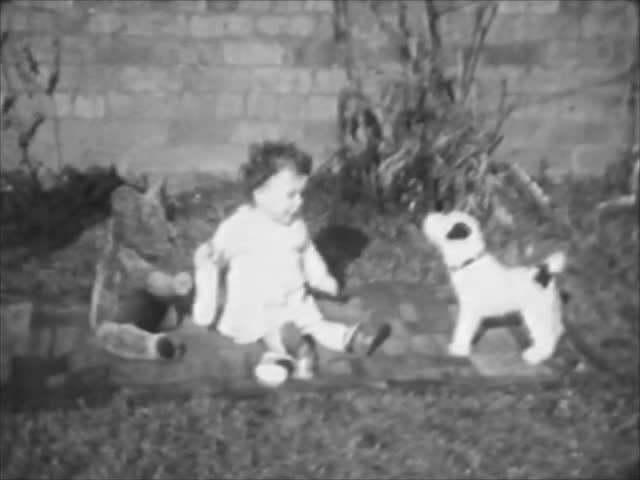 A family film of Avril Brown from an infant of 4 months to a toddler of about 4 years old, on holiday at Portobello, being bathed in a tin tub in front of the fire and playing on her tricycle in the g...