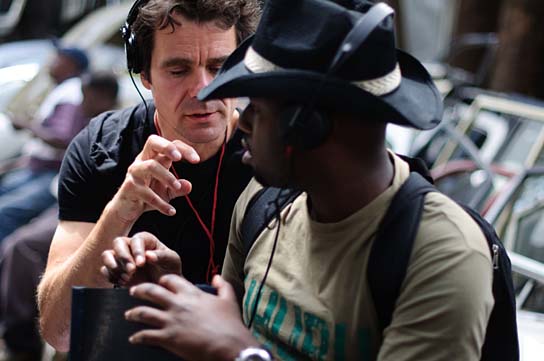 Description: Producer Tom Tykwer, director David Tosh Gitonga (from left to right) on the set