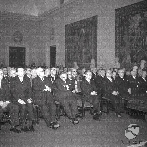 Roma Andreotti, Ruini, Leone, Gronchi, Bosco, Perassi, Togni e Spataro, seduti in prima fila, assistono alla conferenza