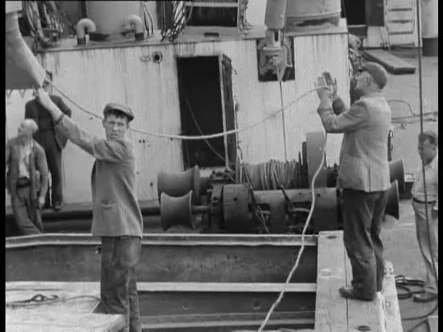 General shots of Leith Docks, with ships unloading cargo, railway sidings and three masted sailing ship.