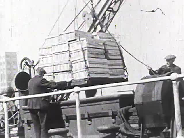 Cargo being loaded and unloaded at Leith docks including coal, timber, fruit and vegetables.