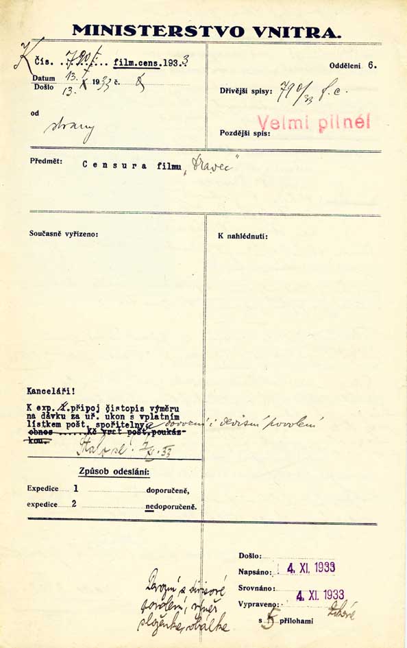 Leírás: Film distributing company applies for new censoring of the film "Dravec". The film was completely interdicted again (3rd censorship).