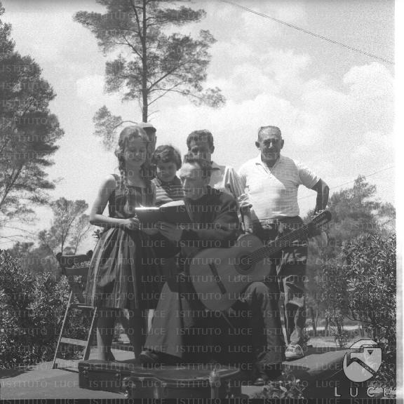 Il gesuita francese Padre Aimé Duval ripreso mentre predica con la chitarra seduto su una staccionata attorniato da diverse persone - totale