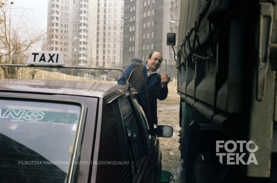 Leírás: Film still from “A Short Film About Killing” (1987), dir. Krzysztof Kieślowski. A cab driver stands next to his car in a scene at a housing estate. Actor Jan Tesarz. Photo: Roman Sumik, transparency, 35 mm format