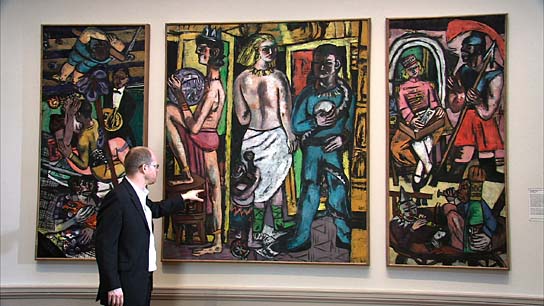 Simon Kelly, curator St. Louis Art Museum, in front of Akrobaten (Triptychon No. 3) in "Max Beckmann - Departure" (2011/12)