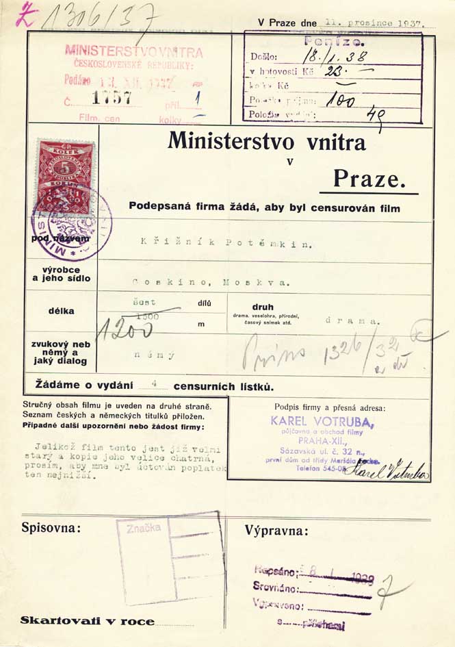 Descrizione: Film distributing company applies for new censoring of the film "Křižník Potěmkin". The film was qualified for public screening - ban for young people.