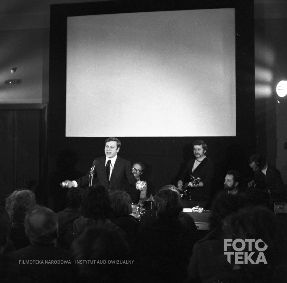 Aprašymas: Film still from “The Scar” (1976), dir. Krzysztof Kieślowski. Group scene. At the microphone: actor Jerzy Stuhr. Photo: Stefan Kurzyp, black and white negative, 6x6 format