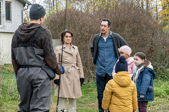 Uygar Tamer (second from left), Hans Löw (third from left), Pola Friedrichs (right) in "Kommt ein Vogel geflogen" (2023)