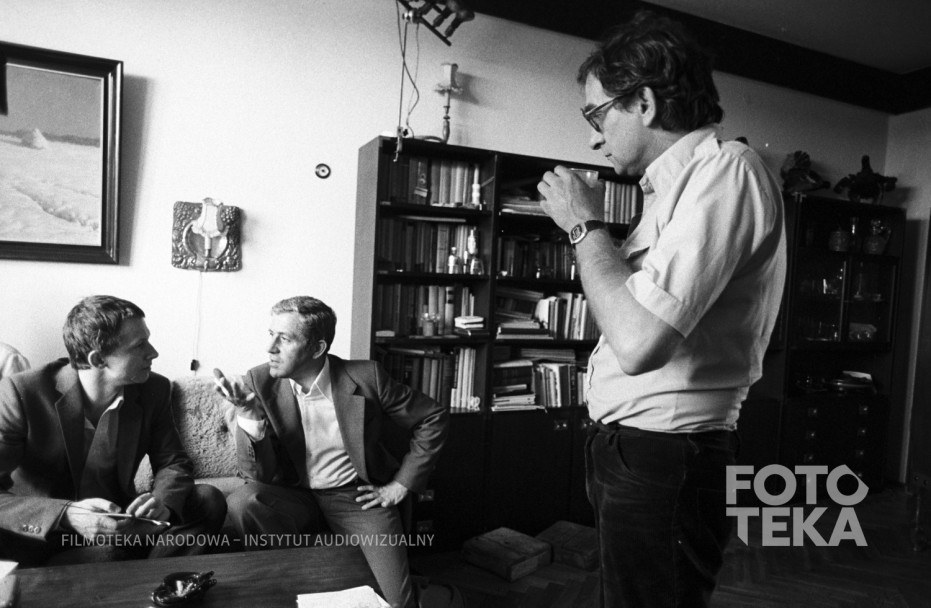 On the set of “Blind Chance” (1981), dir. Krzysztof Kieślowski. From left: actors Bogusław Linda and Zbigniew Zapasiewicz with the director. Photo: Romuald Pieńkowski, black and white negative, 35 mm format