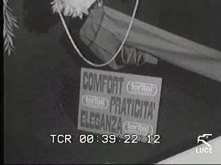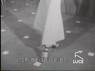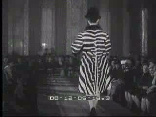 Pierre Cardin entra nel salone della sfilata, guarda verso la cinepresa, il pubblico applaude