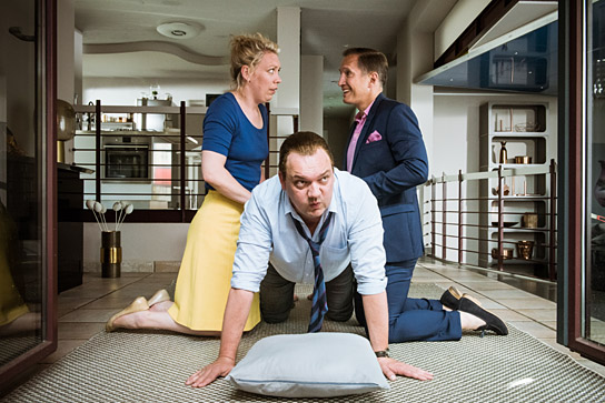 Lina Beckmann, Charly Hübner, Benno Fürmann (left to right) in "Fühlen Sie sich manchmal ausgebrannt und leer?" (2017)