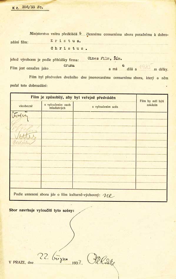 Beskrivelse: Censurní sbor poradní (Censor Advisory Board) suggested qualifying the film "Kristus" for public screening - full permission.