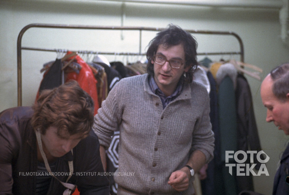 Beskrivelse: On the set of “Personnel” (1975), dir. Krzysztof Kieślowski. From left: actor Tomasz Lengren with the director. Photo: Stefan Kurzyp, color negative, 35 mm format
