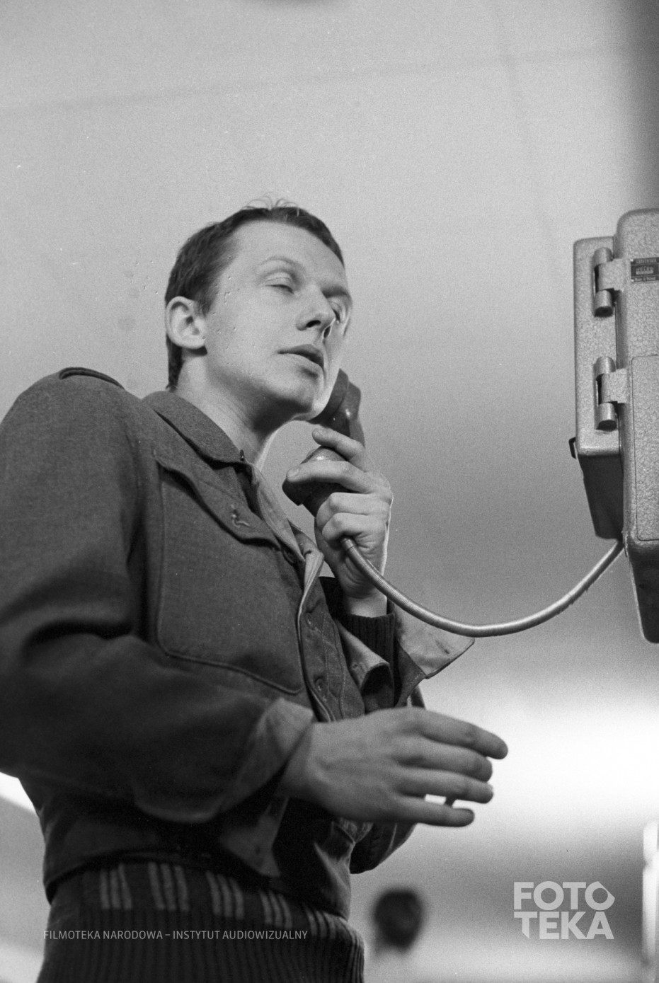Beskrivelse: Film still from “Blind Chance” (1981), dir. Krzysztof Kieślowski. Actor Bogusław Linda talks over the phone in one scene. Photo: Romuald Pieńkowski, black and white negative, 35 mm format