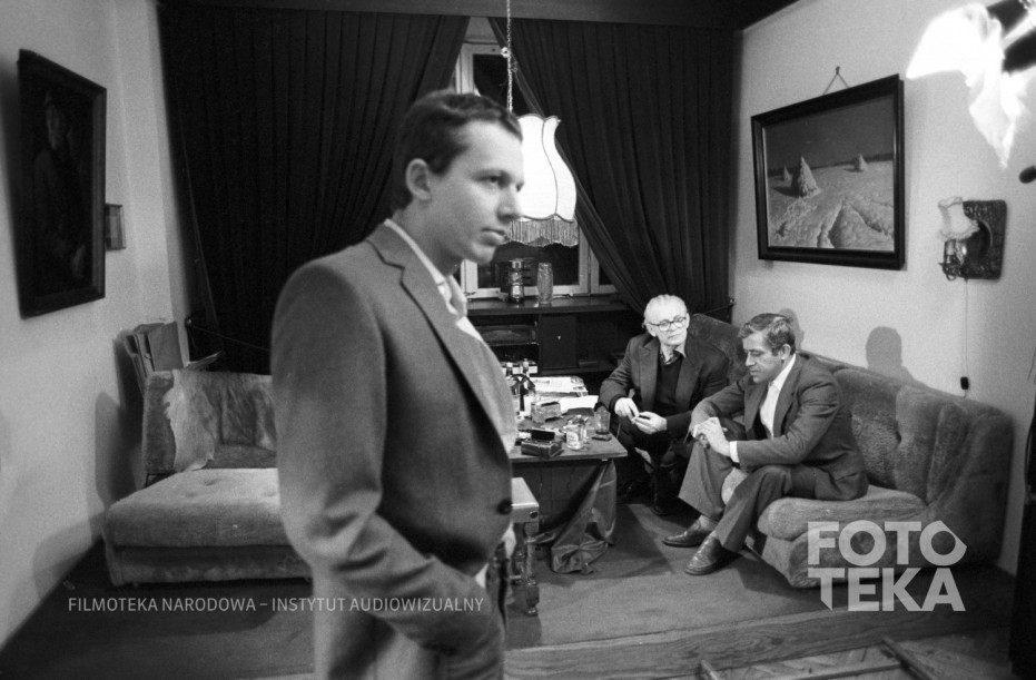 Beskrivelse: Film still from “Blind Chance” (1981), dir. Krzysztof Kieślowski. From left: actors Bogusław Linda, Tadeusz Łomnicki and Zbigniew Zapasiewicz. Photo: Romuald Pieńkowski, black and white negative, 35 mm format