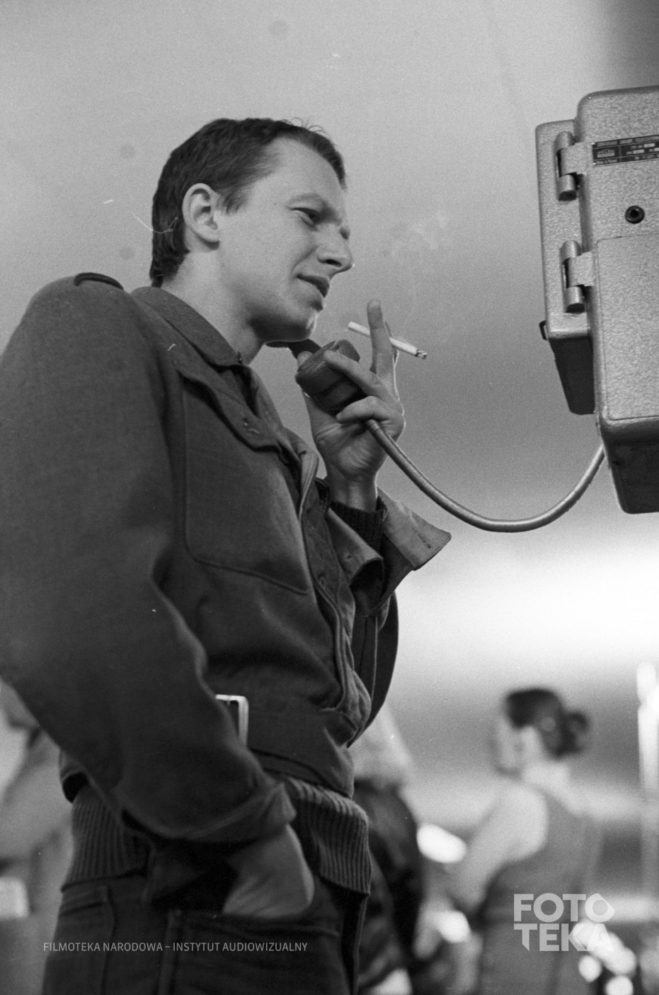 Beskrivelse: Film still from “Blind Chance” (1981), dir. Krzysztof Kieślowski. Actor Bogusław Linda talks over the phone while smoking a cigarette in one scene. Photo: Romuald Pieńkowski, black and white negative, 35 mm format