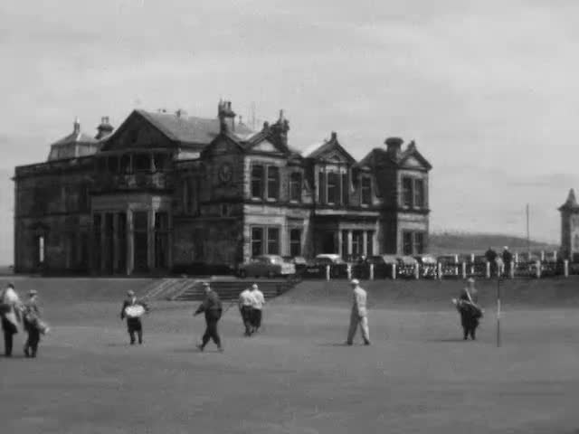 Footage of historical St. Andrews, including the harbour, and cathedral, the Royal and Ancient golf club, and University quadrangle.