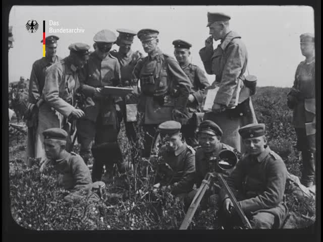 1. Intertitle: Arrival of the daily express to Lille from Berlin. Lille is only 8 km. away from the forwardmost English position. Image: Arrival of the train at the northern railway station; there are...