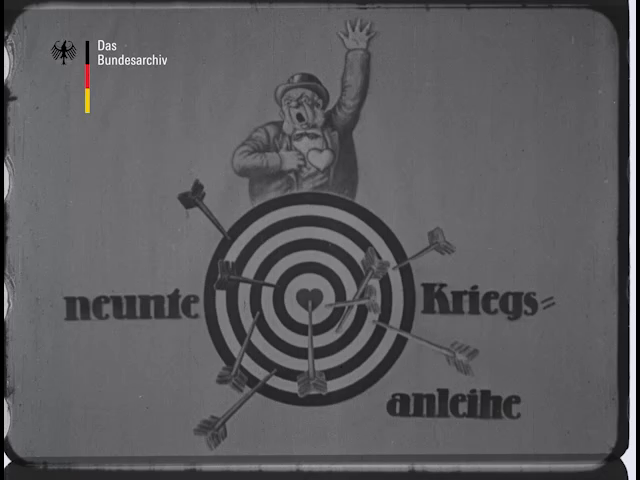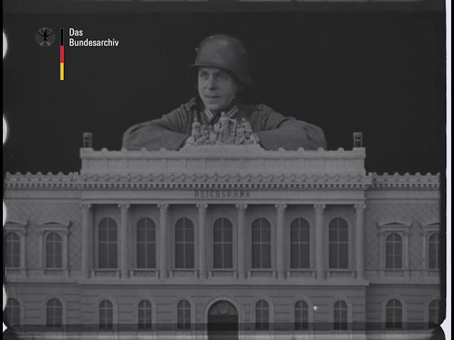 Werbung für die 9. Kriegsanleihe. Hinter dem Modell das Reichsbankgebäudes taucht ein Soldat auf und entrollt ein Plakat mit der Aufschrift: “Auf zur Kriegs-Anleihe”