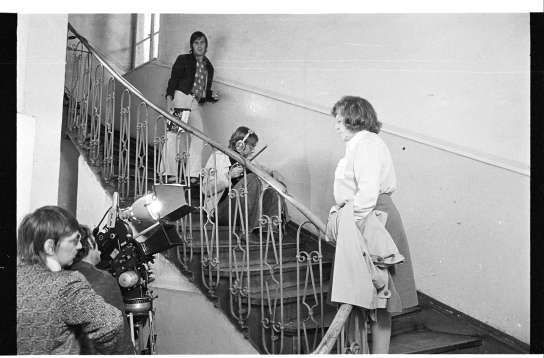 Rainer Werner Fassbinder (1.v.l.), Thomas Schwan (2.v.l.), Christian Hohoff (oben), Fritz Müller-Scherz (sitzend), Brigitte Mira (Dreharbeiten)